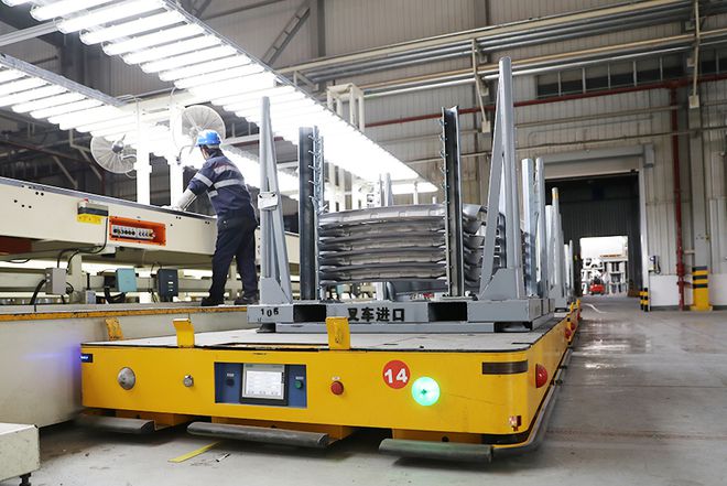 鋼板完成所有沖壓工序之后,都會(huì )經(jīng)過(guò)人工檢查,如果有問(wèn)題會(huì )交到返修部門(mén)。配合檢測的還有平行光檢測室,檢測頻率是50件/次,檢測合格的產(chǎn)品會(huì )由AGV小車(chē)運往倉庫。這種小車(chē)在其他車(chē)間同樣能夠見(jiàn)到,是個(gè)智能的自動(dòng)運輸設備。