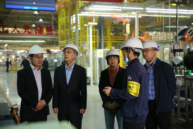 (動(dòng)力領(lǐng)域專(zhuān)家在合肥智慧工廠(chǎng)聆聽(tīng)長(cháng)安工程師講解工廠(chǎng)情況)